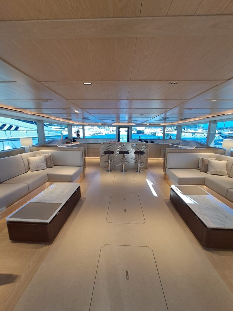 BADE was configured with charter guests in mind, combining spacious accommodation with an open, social layout designed for entertaining. A standout feature is the galley-up, forward arrangement, which creates an inviting main-deck atmosphere and keeps the chef and crew connected to the guest experience – while still maintaining excellent flow between indoor and outdoor living.